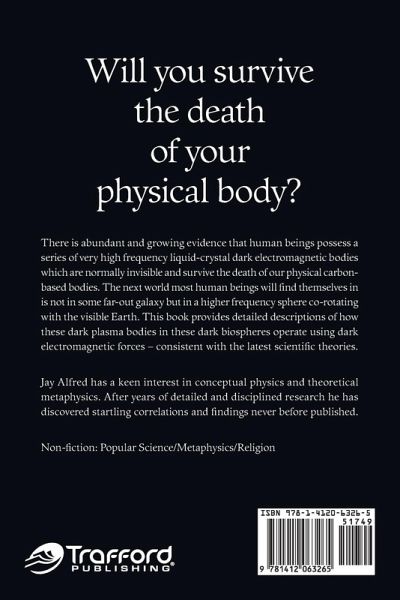 What has plasma and dark matter got to do with your afterlife? In 2005 Jay proposed that dark matter (which comprises about 85 per cent of the matter in the universe) could include self-interacting dark plasma. Subsequently, this proposal received support in the scientific literature. This has significant implications not only for the universe as a whole, but also planet Earth and its inhabitants. In recent years, scientists have pointed out to the life-like characteristics of plasma. How has this life-like dark plasma participated in human evolution? Does dark plasma provide the physical basis for your afterlife? Do we have plasma bodies which co-evolved endosymbiotically with our ordinary matter bodies but are currently invisible to us? This book explores this in detail, while adhering to experimental data, with some surprising conclusions. Highlighted readers' comments: "I have read several books over the years on this theme of correlating science with spirit. They include "The Tao of Physics" and more recently " The Divine Matrix". This masterpiece by Jay Alfred, however, is one of the best because it explores deeper and more passionately than the others. A riveting read and in my opinion, this book should be a best seller." "There's nothing parapsychological/paranormal about it, we just haven't had the science to explain it until now." "I've been reading all three of Jay Alfred's books and, so far, I've seriously enjoyed all of them. I actually haven't been able to put them down." "The first few pages are worth the price of this book."