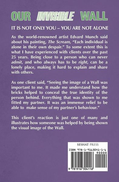 As the world-renowned artist Edvard Munch said about his painting, The Scream, "Each individual is alone in their own despair." To some extent this is what I have experienced with clients over the past 25 years. Being close to a person who can never admit, and who always has to be right, can be a lonely place, making it hard to explain and share with others. As one client said, "Seeing the image of a Wall was important to me. It made me understand how the bricks helped to conceal the true identity of the person behind. Everything that was shown to me fitted my partner. It was an immense relief to be able to make sense of my partner’s behaviour." This client’s reaction is just one of many and illustrates how someone was helped by being shown the visual image of the Wall.