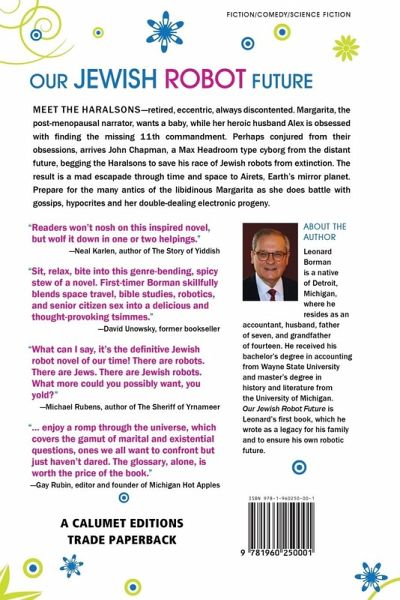 Meet the Haralsons-retired, eccentric, always discontented. Margarita, the post-menopausal narrator, wants a baby, while her heroic husband Alex is obsessed with finding the missing 11th commandment. Perhaps conjured from their obsessions, arrives John Chapman, a Max Headroom type cyborg from the distant future, begging the Haralsons to save his race of Jewish robots from extinction. The result is a mad escapade through time and space to Airets, Earth's mirror planet. Prepare for the many antics of the libidinous Margarita as she does battle with gossips, hypocrites and her double-dealing electronic progeny.