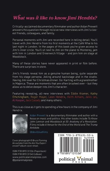 What was it like to know Jimi Hendrix? Critically-acclaimed documentary filmmaker and author Aidan Prewett answers this question through incisive new interviews with Jimi's closest friends, colleagues, and family. Personal moments with Jimi are recorded here in telling detail: You'll travel with Jimi Hendrix from his first moments at the Café Wha to his last night in London. In the pages of this book you're given access to Jimi's inner circle. You'll sit next to Jimi on the plane to Monterey, jam with him in London and Greenwich Village - and join him on stage at Woodstock. Many of these stories have never appeared in print or film before. There are surprises in store. Jimi's friends reveal him as a genuine human being, quite separate from his stage persona. Joking around backstage and in the studio. Having Jimi over for Christmas dinner. Go-Karting with a grandmother in Majorca. These are moments that are often brushed over - but they allow us to delve deeper into Jimi's character. Featuring revealing, all-new interviews with Eddie Kramer, Kathy Ethchingham, Roger Mayer, Leon Hendrix, Keith Altham, Janis Ian, Al Kooper, Jack Casady and many others. This is as close as it gets to spending a few hours in the company of Jimi Hendrix.