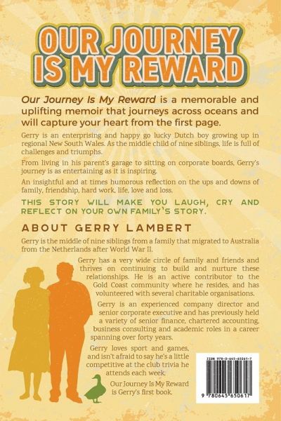 Our Journey is My Reward is a memorable and uplifting memoir that journeys across oceans and will capture your heart from the first page. Gerry is an enterprising and happy go lucky Dutch boy growing up in regional New South Wales. As the middle child of nine siblings, life is full of challenges and triumphs. From living in his parent's garage to sitting on corporate boards, Gerry's journey is as entertaining as it is inspiring. An insightful and at times humorous reflection on the ups and downs of family, friendship, hard work, life, love and loss. This story will make you laugh, cry and reflect on your own family's story.