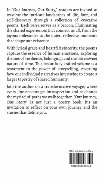 In "Our Journey, Our Story," readers are invited to traverse the intricate landscapes of life, love, and self-discovery through a collection of evocative poems. Each verse serves as a beacon, illuminating the shared experiences that connect us all, from the joyous milestones to the quiet, reflective moments that shape our existence. With lyrical grace and heartfelt sincerity, the poems capture the essence of human emotions, exploring themes of resilience, belonging, and the bittersweet nature of time. This beautifully crafted volume is a testament to the power of storytelling, revealing how our individual narratives intertwine to create a larger tapestry of shared humanity. Join the author on a transformative voyage, where every line encourages introspection and celebrates the myriad of paths we walk together. "Our Journey, Our Story" is not just a poetry book; it's an invitation to reflect on your own journey and the stories that define you.