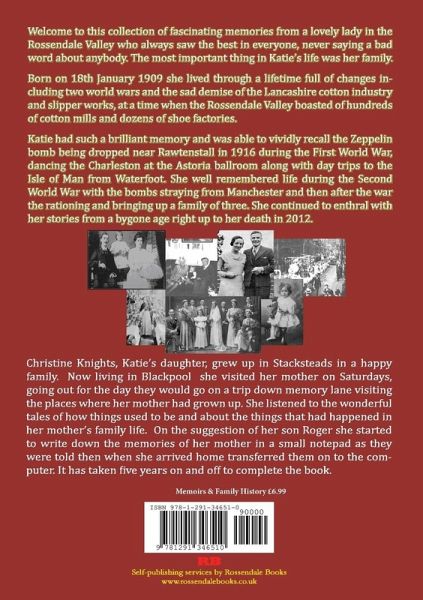 Welcome to this collection of fascinating memories from a lovely lady in the Rossendale Valley who always saw the best in everyone, never saying a bad word about anybody. The most important thing in Katie's life was her family. Born on 18th January 1909 she lived through a life full of changes including two world wars and the sad demise of the Lancashire cotton industry and slipper works, at a time when the Rossendale Valley boasted of hundreds of cotton mills and dozens of shoe factories. Katie had such a brilliant memory and was able to vividly recall the Zeppelin bomb being dropped near Rawtenstall in 1916 during the First World War, dancing the Charleston at the Astoria ballroom along with day trips to the Isle of Man from Waterfoot. She well-remembered life during the Second World War with the bombs straying from Manchester and then after the war the rationing and bringing up a family of three. She continued to enthrall with her stories from a bygone age right up to her death in 2012.