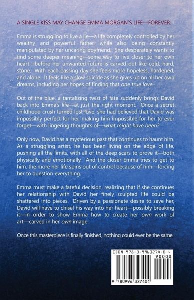A single kiss may change Emma Morgan's life-forever. Emma is struggling to live a lie-a life completely controlled by her wealthy and powerful father, while also being constantly manipulated by her uncaring boyfriend. She desperately wants to find some deeper meaning-some way to live closer to her own heart-before her unwanted future is carved-out like cold, hard, stone. With each passing day she feels more hopeless, hardened, and alone. It feels like a slow suicide as she gives up on all her own dreams, including her hopes of finding that one true love. Out of the blue, a tantalizing twist of fate suddenly brings David back into Emma's life-at just the right moment. Once a secret childhood crush turned lost love, she had believed that David was impossibly perfect for her, making him impossible for her to ever forget-with lingering thoughts of-what might have been? Only now, David has a mysterious past that continues to haunt him. As a struggling artist, he has been living on the edge of life, pushing all the limits, with all of the deep scars to prove it-both physically and emotionally. And the closer Emma tries to get to him, the more her life spins out of control because of him-forcing her to question everything. Emma must make a fateful decision, realizing that if she continues her relationship with David her finely sculpted life could be shattered into pieces. Driven by a passionate desire to save her, David will have to chisel his way into her heart-possibly breaking it-in order to show Emma how to create her own work of art-carved in her own image. Once this masterpiece is finally finished, nothing could ever be the same.