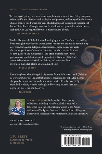 Whether by way of visitations from secular saints, hauntings from childhood, or back talk from "indelicate broads," a complicated world speaks to and through Alison Pelegrin in Our Lady of Bewilderment. An unusual blend of mystic-comedian, Pelegrin explores physical and psychic beauty and terror without losing sight of wonder. Drawing on the aid of beings real and imaginary, Our Lady of Bewilderment offers humorous, honest, and intimate poems contemplating life's traumas and joys, filtered through the religion-infused secular traditions of Louisiana.