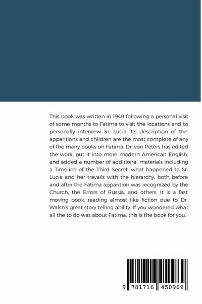 This book was written in 1949 following a personal visit of some months to Fatima to visit the locations and to personally interview Sr. Lucia. Its description of the apparitions and children are the most complete of any of the many books on Fatima. Dr. von Peters has edited the work, put it into more modern American English, and added a number of additional materials including a Timeline of the Third Secret, what happened to Sr. Lucia and her travails with the hierarchy, both before and after the Fatima apparition was recognized by the Church, the Errors of Russia, and others. It is a fast moving book, reading almost like fiction due to Dr. Walsh's great story telling ability. If you wondered what all the to do was about Fatima, this is the book for you.