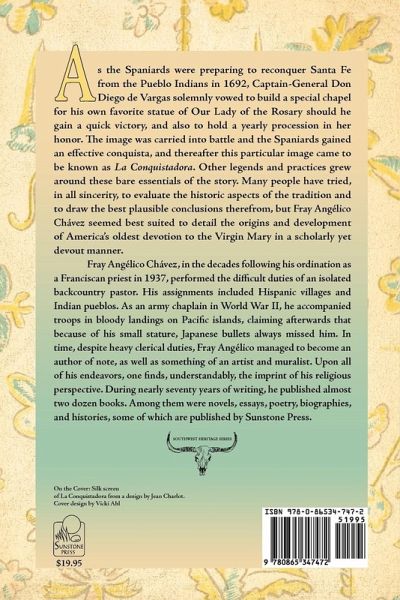 As the Spaniards were preparing to reconquer Santa Fe from the Pueblo Indians in 1692, Captain-General Don Diego de Vargas solemnly vowed to build a special chapel for his own favorite statue of Our Lady of the Rosary should he gain a quick victory, and also to hold a yearly procession in her honor. The image was carried into battle and the Spaniards gained an effective conquista, and thereafter this particular image came to be known as La Conquistadora. Other legends and practices grew around these bare essentials of the story. Many people have tried, in all sincerity, to evaluate the historic aspects of the tradition and to draw the best plausible conclusions therefrom, but Fray Angélico Chávez seemed best suited to detail the origins and development of America's oldest devotion to the Virgin Mary in a scholarly yet devout manner.
