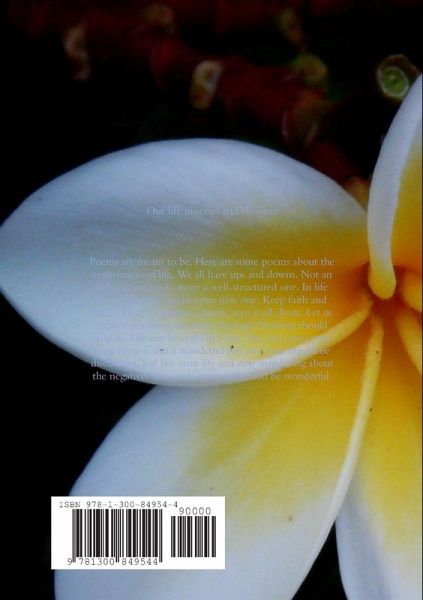 Our life miseries and blessings Poems are meant to be. Here are some poems about the experiences of life. We all have ups and downs. Not an influencing book, more a well-structured one. In life doors keep closing to open new one. Keep faith and belief. Here written in a poetic way, is all about. Let us express ourselves and move forward. Nothing should stop us. Life can be cruel in a way, but, just open your eyes; there is also a wonderful part of it that should be discovered. Just live your life and stop wondering about the negative. Stay cool, stay positive and be wonderful.