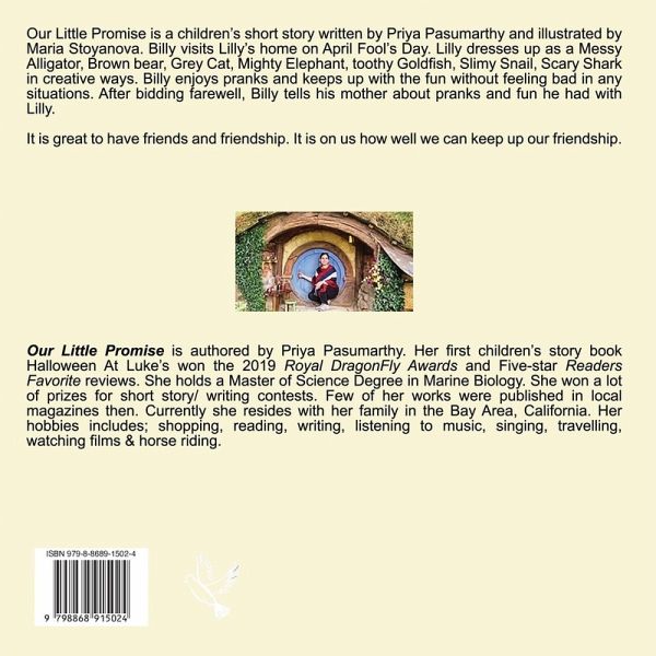 Our Little Promise authored by Priya Pasumarthy and is illustrated by Maria Stoyanova. This beginners story targets little children of ages 3-8 years old.The plot of the story is such that little readers would feel connected with the vibrant illustartions with magical details on each page right from the beginning. The story follows Billy and Lilly, two best friends who love to play together while their mothers spend time together. It's April Fools Day and Lilly dresses up in various costumes pretending to be anything from a cat to a shark. She knocks on the door behind which Billy stands but he refuses to let her into the room, going along with Lilly's shenanigans as she pretends to be these animals.Eventually,Billy lets her in, and they talk about how much fun Lilly's little tricks are. The pair promise to be friends forever, loving their relationship with the other. Our Little Promise is a picture book with a plot that children are sure to be drawn to.The story's simple repetitive language would make reader's engage easily.The story leaves a subtle message in a playful manner. It is great to have friends and friendship.It is on us how well we can keep up our friendship. At a meta level this story sows seeds of diversity, acceptance and a promise to keep it.