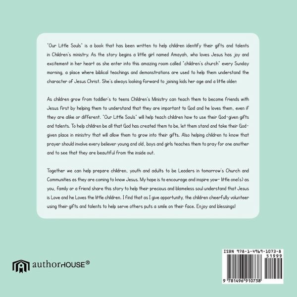 "Our Little Souls" is a book that has been written to help children identify their gifts and talents in Children's ministry. As the story begins a little girl named Amayah, who loves Jesus has joy and excitement in her heart as she enter into this amazing room called "children's church" every Sunday morning, a place where biblical teachings and demonstrations are used to help them understand the character of Jesus Christ. She's always looking forward to joining kids her age and a little older. As children grow from toddler's to teens Children's Ministry can teach them to become friends with Jesus first by helping them to understand that they are important to God and he loves them, even if they are alike or different. "Our Little Souls" will help teach children how to use their God-given gifts and talents. To help children be all that God has created them to be, let them stand and take their God-given place in ministry that will allow them to grow into their gifts. Also helping children to know that prayer should involve every believer young and old, boys and girls teaches them to pray for one another and to see that they are beautiful from the inside out. Together we can help prepare children, youth and adults to be Leaders in tomorrow's Church and Communities as they are coming to know Jesus. My hope is to encourage and inspire yow- little one(s) as you, family or a friend share this story to help their precious and blameless soul understand that Jesus is Love and he Loves the little children. I find that as I give opportunity, the children cheerfully volunteer using their gifts and talents to help serve others puts a smile on their face. Enjoy and blessings!