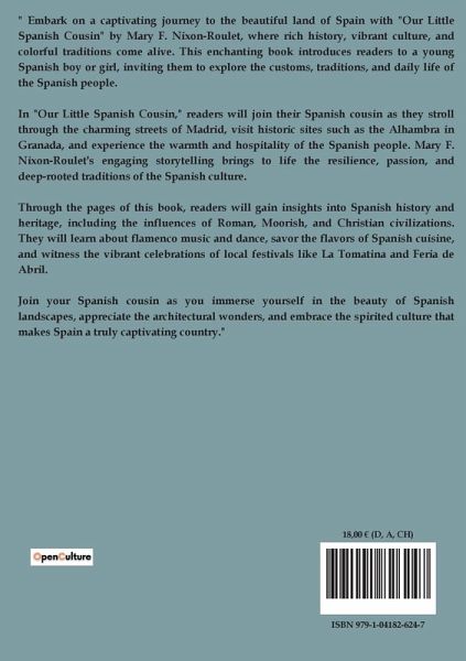 "Our Little Spanish Cousin" by Mary F. Nixon-Roulet is a charming narrative that offers a glimpse into the life of a young boy named Fernando, living in early 20th-century Spain. The story begins with the christening of Fernando's baby sister, an event that introduces readers to the rich cultural traditions and familial bonds that are central to Spanish life. As Fernando grows, he embarks on various adventures, from attending school to visiting the family hacienda, where he learns about the agricultural practices and the beauty of the Spanish countryside. The narrative is interspersed with historical anecdotes, such as the tales of King Pedro the Cruel and the legendary Alhambra, which enrich Fernando's understanding of his heritage. The story also highlights the vibrant celebrations of Spanish festivals, including Christmas, New Year's, and the Carnival, showcasing the joy and communal spirit that define these occasions. Through Fernando's interactions with his family, friends, and the loyal dog Mazo, readers gain insight into the values of loyalty, respect, and the importance of tradition. The book serves as both an educational tool and a delightful story, capturing the essence of Spanish culture and the innocence of childhood.