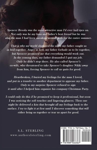 Spencer Brooks was the most attractive man I'd ever laid eyes on. Not only was he my boss and father's best friend but he was also the man I had been sneaking around with for the entire summer. That is why my world shattered the night my father caught us in bed together. Angry as hell, my father forbade us to be together, but Spencer promised me that everything would work out. In the coming days, my father demanded I quit my job. Only he didn't stop there. He also called Spencer's ex-wife, who threatened to take Spencer's daughter Nikki away from him, forcing Spencer to call us quits for good. Heartbroken, I buried my feelings for the man I loved, and put in a transfer to another department to appease my father. Only to my surprise Spencer refused to sign it until after I helped him organize his company Christmas Party. I could only do this if he promised to keep it professional, but soon I was noticing the soft touches and lingering glances. Then one night he delivered a kiss that brought all my feelings back to the surface. I try to fight it at first until I discover something that will either bring us together or tear us apart for good.