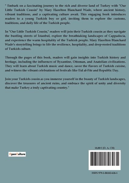 "Our Little Turkish Cousin" by Mary Hazelton Blanchard Wade offers a vivid portrayal of life in early 20th-century Turkey through the eyes of a young boy named Osman. The narrative begins with Osman's early years, highlighting the cultural and traditional practices surrounding his birth and upbringing. As Osman grows, he embarks on his educational journey, attending a local school where he learns to read, write, and recite from the Koran. The story provides insights into the daily life and customs of Turkish society, such as the significance of public baths, the role of the Sultan, and the vibrant street life of Constantinople. Osman's experiences are enriched by interactions with his family, particularly his mother, who organizes social gatherings and shares stories that reflect the values and beliefs of their culture. The narrative also touches on the social hierarchy and the presence of gipsies, offering a broader perspective on the diverse influences within Turkish society. Through Osman's adventures and observations, readers gain an understanding of the complexities and beauty of life in Turkey during this period, as well as the challenges faced by its people under the rule of the Sultan.