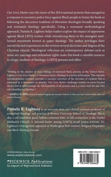Our Lives Matter uses the tenor of the 2014 national protests that emerged as a response to excessive police force against Black people to frame the book as following the discursive tradition of liberation theologies broadly speaking and womanist theology specifically. Using a womanist methodological approach, Pamela R. Lightsey helps readers explore the impact of oppression against Black LBTQ women while introducing them to the emergent intellectual movement known as queer theology. The author privileges their narratives and experiences as she reviews several doctrines and dogma of the Christian church. Theological reflection on contemporary debates such as same-sex marriage and ordination rights make this book a valuable resource to clergy, students of theology, LGBTQ persons and allies. ""Writing in the shadow of mass killings of unarmed black persons in the United States, Lightsey's Our Lives Matter: A Womanist Queer Theology is a timely publication. This valuable interdisciplinary resource provides a succinct overview of the doctrine of creation that is informed by a discussion on identity. Our Lives Matter challenges readers to move beyond theory and to acknowledge the full humanity of all persons and is a must-read for any who self-identifies as Christian."" --Angela D. Sims, Dean of Academic Programs and Associate Professor of Ethics and Black Church Studies, Saint Paul School of Theology Pamela R. Lightsey is an associate dean and clinical assistant professor of contextual theology and practice at Boston University School of Theology. She is also a self-identified queer lesbian ordained elder in full connection in the United Methodist Church. A national leader among LGBTQ social justice activists, Dr. Lightsey's writings have appeared in Washington Post (online), Religion Dispatches and Black Theology Journal.