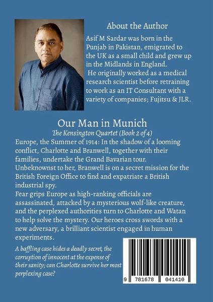 OUR MAN IN MUNICH (2/4) The Kensington Quartet; Four Charlotte Holmes mysteries set in Europe during the Great War. MUNICH, 1914. Charlotte Holmes, a brilliant polymath, and her former companion Dr Watan, an Indian doctor, are reconciled and engage in their most complex and daunting case. Europe, the Summer of 1914: In the shadow of a looming conflict, Charlotte and Branwell, together with their families, undertake the Grand Bavarian tour. Unbeknownst to her, Branwell is on a secret mission for the British Foreign Office to find and expatriate a British industrial spy. However complications arise when the German secret police track down the spy and Branwell is forced to enlist the help of his wife Becky. Fear grips Europe as high-ranking officials are assassinated, attacked by a mysterious wolf-like creature, and the perplexed authorities turn to Charlotte and Watan to help solve the mystery. Our heroes cross swords with a new adversary, a brilliant scientist engaged in human experiments designed to create a superweapon for the coming war. A baffling case hides a deadly secret, the corruption of innocent at the expense of their sanity; can Charlotte survive her most perplexing case?