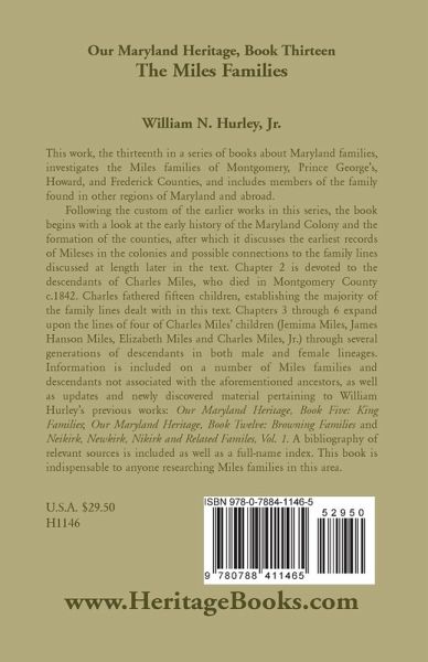 This work, the thirteenth in a series of books about Maryland families, investigates the Miles families of Montgomery, Prince George's, Howard, and Frederick Counties, and includes members of the family found in other regions of Maryland and abroad. Following the custom of the earlier works in this series, the book begins with a look at the early history of the Maryland Colony and the formation of the counties, after which it discusses the earliest records of Mileses in the colonies and possible connections to the family lines discussed at length later in the text. Chapter 2 is devoted to the descendants of Charles Miles, who died in Montgomery County c.1842. Charles fathered fifteen children, establishing the majority of the family lines dealt with in this text. Chapters 3 through 6 expand upon the lines of four of Charles Miles' children (Jemima Miles, James Hanson Miles, Elizabeth Miles and Charles Miles, Jr.) through several generations of descendants in both male and female lineages. Information is included on a number of Miles families and descendants not associated with the aforementioned ancestors, as well as updates and newly discovered material pertaining to William Hurley's previous works: Our Maryland Heritage, Book Five: King Families; Our Maryland Heritage, Book Twelve: Browning Families and Neikirk, Newkirk, Nikirk and Related Familes, Vol. 1. A bibliography of relevant sources is included as well as a full-name index. This book is indispensable to anyone researching Miles families in this area.
