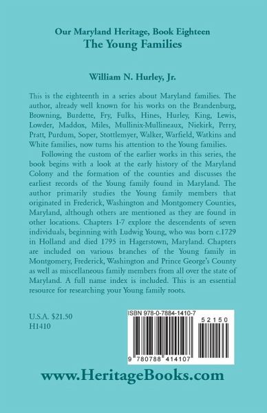 This is the eighteenth in a series about Maryland families. The author, already well known for his works on the Brandenburg, Browning, Burdette, Fry, Fulks, Hines, Hurley, King, Lewis, Lowder, Maddox, Miles, Mullinix-Mullineaux, Niekirk, Perry, Pratt, Purdum, Soper, Stottlemyer, Walker, Warfield, Watkins and White families, now turns his attention to the Young families. Following the custom of the earlier works in this series, the book begins with a look at the early history of the Maryland Colony and the formation of the counties and discusses the earliest records of the Young family found in Maryland. The author primarily studies the Young family members that originated in Frederick, Washington and Montgomery Counties, Maryland, although others are mentioned as they are found in other locations. Chapters 1-7 explore the descendents of seven individuals, beginning with Ludwig Young, who was born c.1729 in Holland and died 1795 in Hagerstown, Maryland. Chapters are included on various branches of the Young family in Montgomery, Frederick, Washington and Prince George's County as well as miscellaneous family members from all over the state of Maryland. A full name index is included. This is an essential resource for researching your Young family roots.