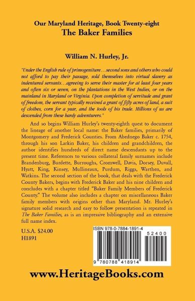 "Under the English rule of primogeniture...second sons and others who could not afford to pay their passage, sold themselves into virtual slavery as indentured servants...agreeing to serve their master for at least four years and often six or seven, on the plantations in the West Indies, or on the mainland in Maryland or Virginia. Upon completion of servitude and grant of freedom, the servant typically received a grant of fifty acres of land, a suit of clothes, corn for a year, and the tools of his trade. Millions of us are descended from these hardy adventurers." And so begins William Hurley's twenty-eighth quest to document the lineage of another local name, the Baker families, primarily of Montgomery and Frederick Counties. From Abednego Baker c. 1754, through his son Larkin Baker, his children and grandchildren, the author identifies hundreds of direct name descendants up to the present time. References to various collateral family surnames include Brandenburg, Burdette, Burroughs, Cromwell, Davis, Dorsey, Duvall, Hyatt, King, Kinsey, Mullineaux, Purdum, Riggs, Warthen, and Watkins. The second section of the book that deals with the Frederick County Bakers begins with Frederick Baker and his nine children and concludes with a chapter titled Baker Family Members of Frederick County. The volume also includes a chapter on miscellaneous Baker family members with origins other than Maryland. Mr. Hurley's signature solid research and easy to follow presentation is repeated in The Baker Families, as is an impressive bibliography and an extensive full name index.