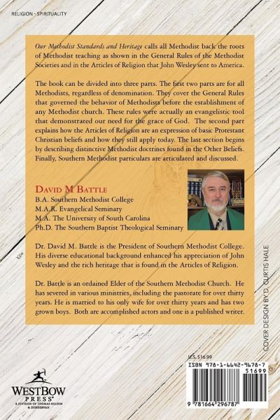 Our Methodist Standards and Heritage calls all Methodist back the roots of Methodist teaching as shown in the General Rules of the Methodist Societies and in the Articles of Religion that John Wesley sent to America. The book can be divided into three parts. The first two parts are for all Methodists, regardless of denomination. They cover the General Rules that governed the behavior of Methodists before the establishment of any Methodist church. These rules were actually an evangelistic tool that demonstrated our need for the grace of God. The second part explains how the Articles of Religion are an expression of basic Protestant Christian beliefs and how they still apply today. The last section begins by describing distinctive Methodist doctrines found in the Other Beliefs. Finally, Southern Methodist particulars are articulated and discussed.