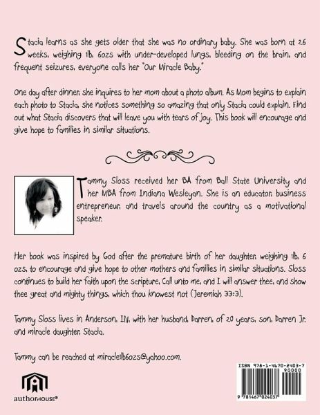 Stacia learns as she gets older that she was no ordinary baby. She was born at 26 weeks, weighing 1lb, 6ozs with under-developed lungs, bleeding on the brain, and frequent seizures, everyone calls her "Our Miracle Baby." One day after dinner, she inquires to her mom about a photo album. As Mom begins to explain each photo to Stacia, she notices something so amazing that only Stacia could explain. Find out what Stacia discovers that will leave you with tears of joy. This book will encourage and give hope to families in similar situations.