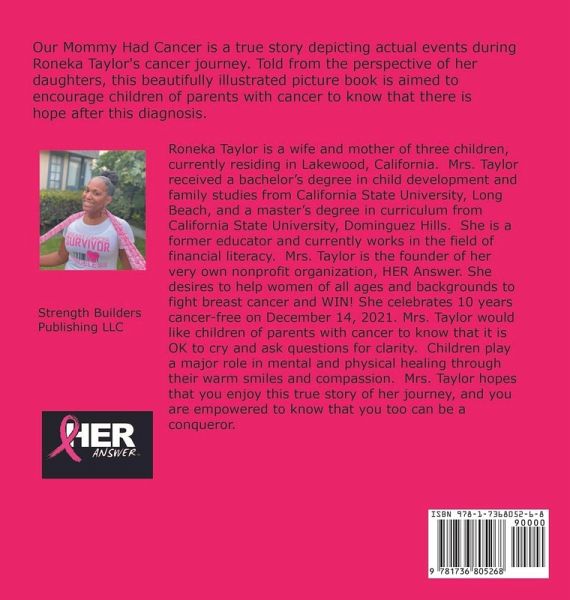 The perfect book for children of parents with a cancer diagnosis! Our Mommy Had Cancer is a true story depicting actual events during Roneka Taylor's cancer journey. Told from the perspective of her daughters, this beautifully illustrated picture book is aimed to encourage children of parents with cancer to know that there is hope after this diagnosis.