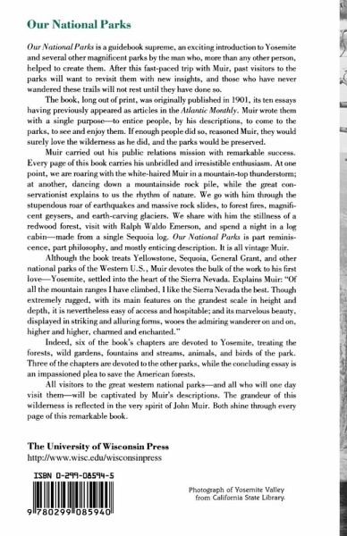 Our National Parks is a guidebook supreme, an exciting introduction to Yosemite and several other magnificent parks by the man who, more than any other person, helped to create them. After this fast-paced trip with Muir, past visitors to the parks will want to revisit them with new insights, and those who have never wandered these trails will not rest until they have done so. The book, long out of print, was originally published in 1901, its ten essays having previously appeared as articles in the Atlantic Monthly. Muir wrote them with a single purpose--to entice people, by his descriptions, to come to the parks, to see and enjoy them. If enough people did so, reasoned Muir, they would surely love the wilderness as he did, and the parks would be preserved. Muir carried out his public relations mission with remarkable success. Every page of this book carries his unbridled and irresistible enthusiasm. Our National Parks is part reminiscence, part philosophy, and mostly enticing description. It is all vintage Muir. Although the book treats Yellowstone, Sequoia, General Grant, and other national parks of the Western U.S., Muir devotes the bulk of the work to his first love--Yosemite, settled into the heart of the Sierra Nevada. Indeed, six of the book's chapters are devoted to Yosemite, treating the forests, wild gardens, fountains and streams, animals, and birds of the park. The concluding essay is an impassioned plea to save American forests. All visitors to the great western national parks--and all who will one day visit them--will be captivated by Muir's descriptions. The grandeur of this wilderness is reflected in the very spirit of John Muir. Both shine through every page of this remarkable book.