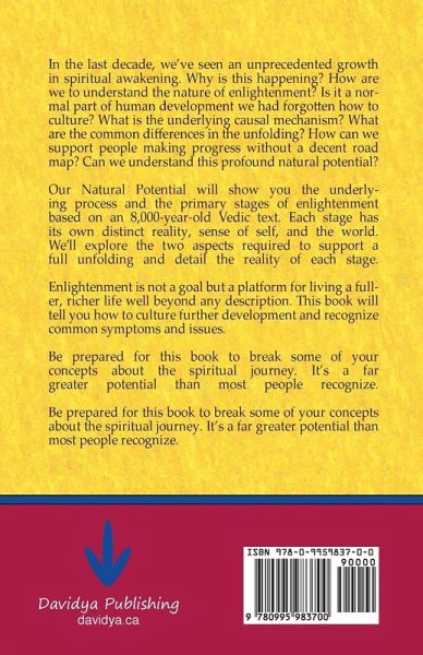 In the last decade, we've seen an unprecedented growth in spiritual awakening. Why is this happening? How are we to understand the nature of enlightenment? Is it a normal part of human development we had forgotten how to culture? What is the underlying causal mechanism? What are the common differences in experiencing the unfolding? How can we support people making progress without a decent road map? Can we understand this profound natural potential? Our Natural Potential will show you the underlying process and the main stages of enlightenment based on an 8,000-year-old Vedic text. Each stage has its own distinct reality, sense of self and the world. We'll explore the two aspects required to support a full unfolding and detail the reality of each stage. Enlightenment is not a goal but rather a platform for living a fuller, richer life well beyond any description. This book will discuss how to culture further development and recognize common symptoms and issues. It will allow you to put spiritual teachings into a broader context. Be prepared to have some of your concepts about the spiritual journey broken. It's a far greater potential than most people recognize.