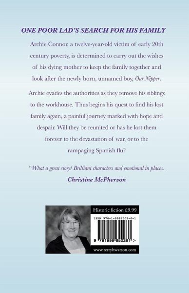 Terry H Watson qualified in D.C.E. and Dip.Sp.Ed. from Notre Dame College, Glasgow and Bearsden, and obtained a B.A. degree from Open University Scotland. A retired special needs teacher, Terry began writing in 2014 and has published a mystery thriller trilogy, THE LUCY TRILOGY: CALL MAMA; SCAMPER'S FIND; THE LECI LEGACY. She has written a compilation of short stories: A TALE OR TWO AND A FEW MORE; and a children's book: THE CLOCK THAT LOST ITS TICK AND OTHER TALES. Her second book in a Novella trilogy - JULIE SINCLAIR INVESTIGATES - has recently been published, adding A BREAK for JULIE to the earlier A CASE for JULIE, to be followed in due course by A LETTER for JULIE. She has since added BEFORE LUCY as a prequel to the highly acclaimed LUCY TRILOGY. This latest work, OUR NIPPER, is a standalone novel set at the time of WW1.