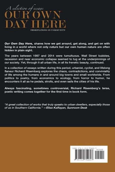 Urbanist, cyclist, and lifelong flaneur Richard Risemberg explores the chaos, contradictions, and conviviality of life among the humans in and around big towns and small worldwide. From politics to poetry, from economics to ecology, from horror to humor, he encounters it all as he pedals, strolls, and even sails the cities of his life.... "Our Own Day Here" is a collection of observations on community, exploring how we get around, get along, and get a living in a world where not only nature but our own human nature are often hidden in plain sight. It is about the sensations of city living, and the relationships of people across time and space.