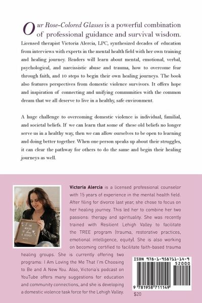 Our Rose-Colored Glasses is a powerful combination of professional guidance and survival wisdom. Licensed therapist Victoria Alercia, LPC, synthesized decades of education from interviews with experts in the mental health field with her own training and healing journey. Readers will learn about mental, emotional, verbal, psychological, and narcissistic abuse and trauma, how to overcome fear through faith, and 10 steps to begin their own healing journeys. The book also features perspectives from domestic violence survivors. It offers hope and inspiration of connecting and unifying communities with the common dream that we all deserve to live in a healthy, safe environment. If we can agree that we all deserve to live in a healthier, safer world, we can choose to break it down by focusing on our communities, families, and ourselves. A huge challenge to overcoming domestic violence is individual, familial, and societal beliefs. If we can learn that some of these old beliefs no longer serve us in a healthy way, then we can allow ourselves to be open to learning and doing better together. When one person speaks up about their struggles, it can clear the pathway for others to do the same and begin their healing journeys as well.