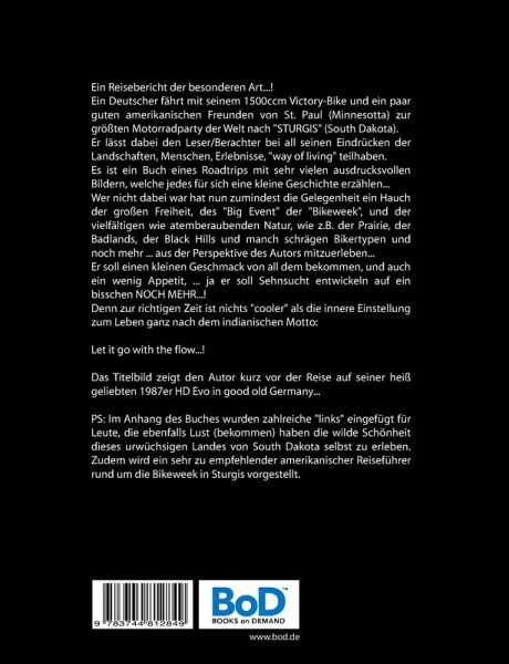 Ein Reisebericht der besonderen Art ...Ein Deutscher fährt mit einem 1500ccm Victory-Bike und ein paar guten amerikanischen Freunden von St. Paul (Minnesotta) zur größten Motorradparty der Welt nach "STURGIS" (South Dakota). Er lässt den Leser/Betrachter bei all seinen Eindrücken der Landschaften, Menschen, Erlebnisse, Way of living teilhaben. Es ist ein Buch eines Roadtrips mit vielen ausdrucksvollen Bildern, welche jedes für sich alleine sprechen ...Wer nicht dabei war, hat nun zumindest die Gelegenheit, einen Hauch der großen Freiheit, des "Big Event" der "Bike Week" und der vielfältigen wie atemberaubenden Natur, wie z.B. der Prairie, der Badlands und der Black Hills aus der Perspektive des Autors mitzuerleben. Er soll einen kleinen Geschmack von all dem bekommen und auch ein wenig Appetit, ... ja er soll Sehnsucht entwickeln auf ein bisschen NOCH MEHR ...Denn zur richtigen Zeit ist nichts cooler als die innere Einstellung zum Leben nach dem indianischen Motto: Let it go withthe flow ...!