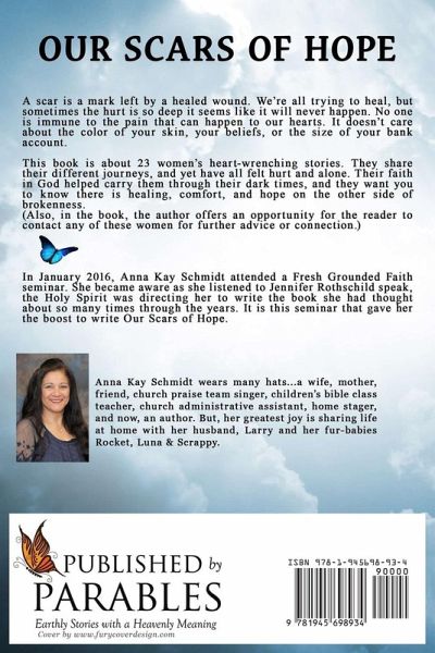 A scar is a mark left by a healed wound. We’re all trying to heal, but sometimes the hurt is so deep it seems like it will never happen. No one is immune to the pain that can happen to our hearts. It doesn't care about the color of your skin, your beliefs, or the size of your bank account. This book is about 23 women’s heart-wrenching stories. They share their different journeys, and yet have all felt hurt and alone. Their faith in God helped carry them through their dark times, and they want you to know there is healing, comfort, and hope on the other side of brokenness. (Also, in the book, the author offers an opportunity for the reader to contact any of these women for further advice or connection.) ___________ In January 2016, Anna Kay Schmidt attended a Fresh Grounded Faith seminar. She became aware as she listened to Jennifer Rothschild speak, the Holy Spirit was directing her to write the book she had thought about so many times through the years. It is this seminar that gave her the boost to write Our Scars of Hope. Anna Kay Schmidt wears many hats...a wife, mother, friend, church praise team singer, children's bible class teacher, church administrative assistant, home stager, and now, an author. But, her greatest joy is sharing life at home with her husband, Larry and her fur-babies Rocket, Luna & Scrappy.