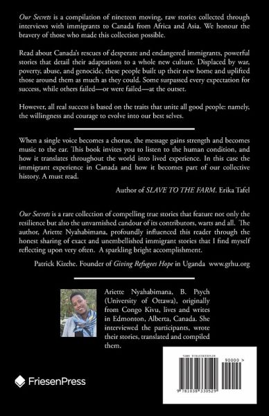 Our Secrets is a compilation of nineteen moving, raw stories collected through interviews with immigrants to Canada from Africa and Asia. We honour the bravery of those who made this collection possible. Read about Canada's rescues of desperate and endangered immigrants, powerful stories that detail their adaptations to a whole new culture. Displaced by war, poverty, abuse, and genocide, these people built up their new home and uplifted those around them as much as they could. Some surpassed every expectation for success, whileothers failed-or were failed-at the outset. However, all real success is based on the traits that unite all good people: namely, the willingness and courage to evolve into our best selves.