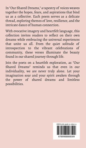 In "Our Shared Dreams," a tapestry of voices weaves together the hopes, fears, and aspirations that bind us as a collective. Each poem serves as a delicate thread, exploring themes of love, resilience, and the intricate dance of human connection. With evocative imagery and heartfelt language, this collection invites readers to reflect on their own dreams while embracing the universal experiences that unite us all. From the quiet solitude of introspection to the vibrant celebrations of community, these verses illuminate the beauty found in our shared journey through life. Join the poets on a heartfelt exploration, as "Our Shared Dreams" reminds us that even in our individuality, we are never truly alone. Let your imagination soar and your spirit awaken through the power of shared dreams and limitless possibilities.