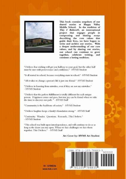 This book contains snapshots of our shared story at Happy Valley Middle School. With a deeper understanding of our core values, and by sharing our stories, our school can continue to grow together, celebrate writing, and continue a lasting tradition.