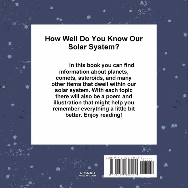 How well do you know our solar system? In this book you can find information about planets, comets, asteroids, and many other items that dwell within our solar system. With each topic there will also be a poem and illustration that might help you remember everything a little bit better. Enjoy reading!