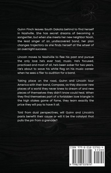 Quinn Finch leaves South Dakota behind to find herself in Nashville. She has secret dreams of being a songwriter, but when she meets her new neighbor, Noah, the lead singer of an undiscovered band, her plan changes trajectory as she finds herself at the wheel of an overnight success. Lincoln moves to Nashville to flee his past and pursue the only love he's ever had, music. He's focused, practiced and most of all, he's been sober for two years. He's about to wave his white flag when he sees a flier to audition for a band.Taking place on the road, Quinn and Lincoln tour America with their band, Compass as they discover new places of a world they never knew to dream of and new pieces of themselves they didn't know could heal. When they find themselves in a forbidden love triangle in the high stakes game of fame, they learn exactly the price they will pay to have it all.Told from dual perspectives, will Quinn and Lincoln's pasts benefit their cause or will it be the catalyst that pulls the pin from a grenade?