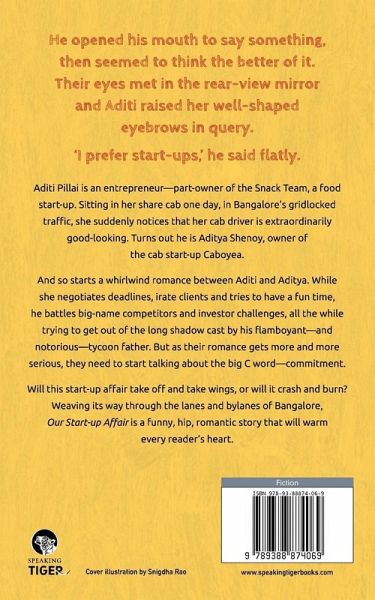 A romance about modern lives as lived in India's tech capital and city of youth, Bangalore. He opened his mouth to say something, then seemed to think the better of it. Their eyes met in the rear-view mirror and Aditi raised her well-shaped eyebrows in query. 'I prefer start-ups,' he said flatly. Aditi Pillai is an entrepreneur-part-owner of the Snack Team, a food start-up. Sitting in her shared cab one day, in Bangalore's gridlocked traffic, she suddenly notices that her cab driver is extraordinarily good-looking. Turns out he is Aditya Shenoy, owner of cab aggregator start-up Caboyea. And so starts a whirlwind romance between Aditi and Aditya. While she negotiates deadlines, irate clients and tries to have a fun time of it, he battles big-name competitors and driver integrity, all the while trying to get out of the long shadow cast by his flamboyant-and notorious-tycoon father. But as their romance gets more and more serious, they need to start talking about the big C word-commitment. Will this Bangalore start-up affair take off and take wings, or will it crash and burn? Weaving its way through the lanes and bylanes of Bangalore, India's start-up capital, Our Start-up Affair is a funny, hip, romantic story that will warm every reader's heart.