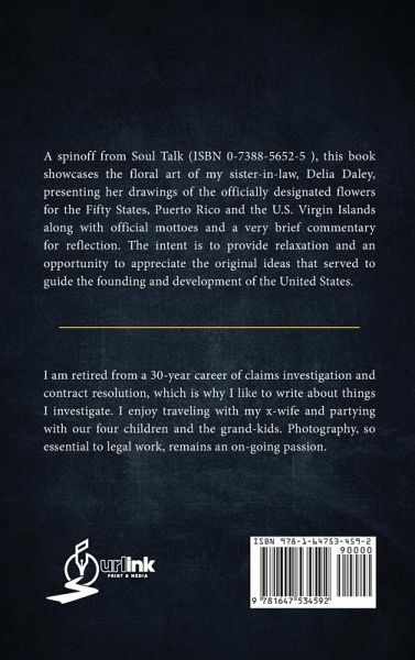 A spinoff from Soul Talk (ISBN 0-7388-5652-5 ), this book showcases the floral art of my sister-in-law, Delia Daley, presenting her drawings of the officially designated flowers for the Fifty States, Puerto Rico and the U.S. Virgin Islands along with official mottoes and a very brief commentary for reflection. The intent is to provide relaxation and an opportunity to appreciate the original ideas that served to guide the founding and development of the United States. I am retired from a 30-year career of claims investigation and contract resolution, which is why I like to write about things I investigate. I enjoy traveling with my x-wife and partying with our four children and the grand-kids. Photography, so essential to legal work, remains an on-going passion.