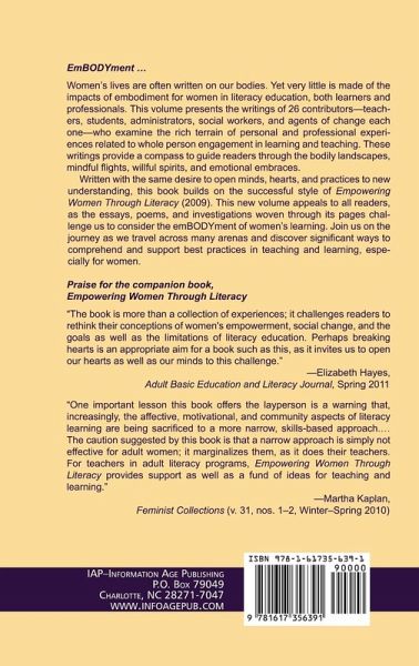 A volume in the series: Adult Education Special Topics, Research & Practice in Lifelong Learning, Series Editor: Kathleen P. King Women's lives are often written on our bodies. Yet very little is made of the impacts of embodiment for women in literacy education, both learners and professionals. This volume presents the writings of 26 contributors-teachers, students, and administrators-who examine the rich terrain of personal and professional experiences related to whole person engagement in learning and teaching. These writings provide a compass to guide readers through the bodily landscapes, mindful flights, willful spirits, and emotional embraces. Written with the same desire to open minds, hearts and practices to new understanding, this book builds on the successful style of Empowering Women through Literacy (2009). This new volume appeals to all readers, as the essays, poems, and investigations woven through its pages challenge us to consider the emBODYment of women's learning. Join us on the journey as we travel across many arenas and discover significant ways to comprehend and support best practices in teaching and learning, especially for women.