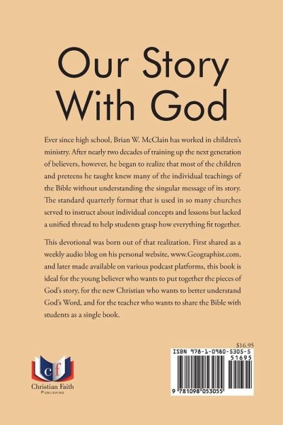 Ever since high school, Brian W. McClain has worked in children's ministry. After nearly two decades of training up the next generation of believers, however, he began to realize that most of the children and preteens he taught knew many of the individual teachings of the Bible without understanding the singular message of its story. The standard quarterly format that is used in so many churches served to instruct about individual concepts and lessons but lacked a unified thread to help students grasp how everything fit together. This devotional was born out of that realization. First shared as a weekly audio blog on his personal website, www.Geographist.com, and later made available on various podcast platforms, this book is ideal for the young believer who wants to put together the pieces of God's story, for the new Christian who wants to better understand God's Word, and for the teacher who wants to share the Bible with students as a single book.