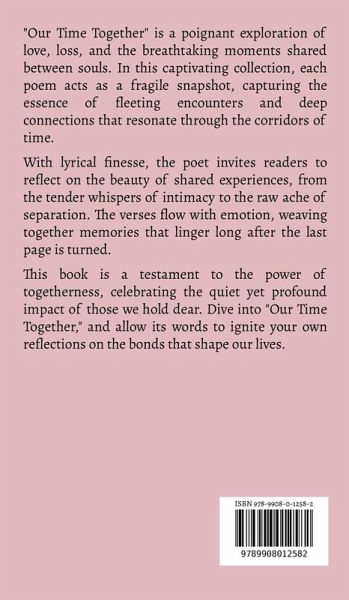 "Our Time Together" is a poignant exploration of love, loss, and the breathtaking moments shared between souls. In this captivating collection, each poem acts as a fragile snapshot, capturing the essence of fleeting encounters and deep connections that resonate through the corridors of time. With lyrical finesse, the poet invites readers to reflect on the beauty of shared experiences, from the tender whispers of intimacy to the raw ache of separation. The verses flow with emotion, weaving together memories that linger long after the last page is turned. This book is a testament to the power of togetherness, celebrating the quiet yet profound impact of those we hold dear. Dive into "Our Time Together," and allow its words to ignite your own reflections on the bonds that shape our lives.