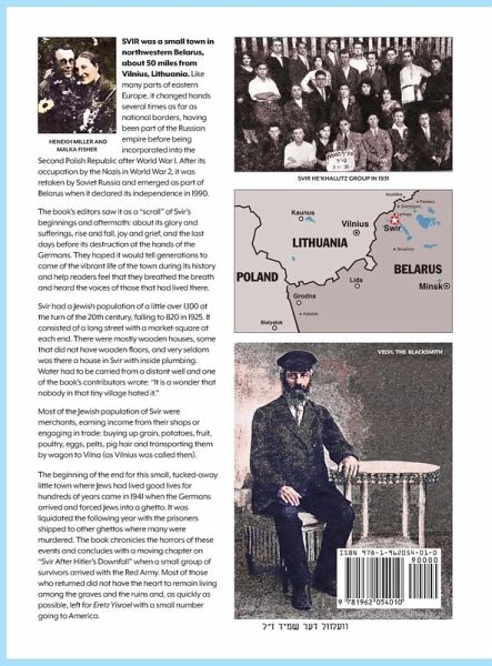 This is the English translation of "Ayaratenu Swir". Svir was a small town in northwestern Belarus, about 50 miles from Vilnius, Lithuania. Like many parts of eastern Europe, it changed hands several times as far as national borders, having been part of the Russian empire before being incorporated into the Second Polish Republic after World War I. After its occupation by the Nazis in World War 2, it was retaken by Soviet Russia and emerged as part of Belarus when it declared its independence in 1990. The book's editors saw it as a "scroll" of Svir's beginnings and aftermath: about its glory and sufferings, rise and fall, joy and grief, and the last days before its destruction at the hands of the Germans. They hoped it would tell generations to come of the vibrant life of the town during its history and help readers feel that they breathed the breath and heard the voices of those that had lived there. Svir had a Jewish population of a little over 1,100 at the turn of the 20th century, falling to 820 in 1925. It consisted of a long street with a market-square at each end. There were mostly wooden houses, some that did not have wooden floors, and very seldom was there a house in Svir with inside plumbing. Water had to be carried from a distant well and one of the book's contributors wrote: "It is a wonder that nobody in that tiny village hated it." Most of the Jewish population of Svir were merchants, earning income from their shops or engaging in trade: buying up grain, potatoes, fruit, poultry, eggs, pelts, pig hair and transporting them by wagon to Vilna (as Vilnius was called then). The beginning of the end for this small, tucked-away little town where Jews had lived good lives for hundreds of years came in 1941 when the Germans arrived and forced Jews into a ghetto. It was liquidated the following year with the prisoners shipped to other ghettos where many were murdered. The book chronicles the horrors of these events and concludes with a moving chapter on "Svir After Hitler's Downfall" when a small group of survivors arrived with the Red Army. Most of those who returned did not have the heart to remain living among the graves and the ruins and, as quickly as possible, left for Eretz Israel with a small number going to America.