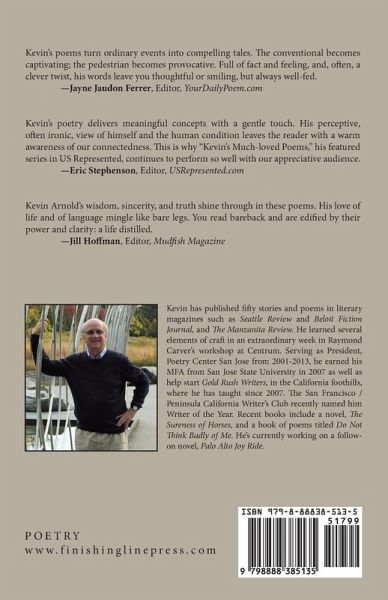 Kevin's poems turn ordinary events into compelling tales. The conventional becomes captivating; the pedestrian becomes provocative. Full of fact and feeling, and, often, a clever twist, his words leave you thoughtful or smiling, but always well-fed.-Jayne Jaudon Ferrer, Editor, YourDailyPoem.com Kevin's poetry delivers meaningful concepts with a gentle touch. His perceptive, often ironic, view of himself and the human condition leaves the reader with a warm awareness of our connectedness. This is why "Kevin's Much-loved Poems," his featured series in US Represented, continues to perform so well with our appreciative audience.-Eric Stephenson, Editor, USRepresented.com Kevin Arnold's wisdom, sincerity, and truth shine through in these poems. His love of life and of language mingle like bare legs. You read bareback and are edified by their power and clarity: a life distilled.-Jill Hoffman, Editor, Mudfish Magazine