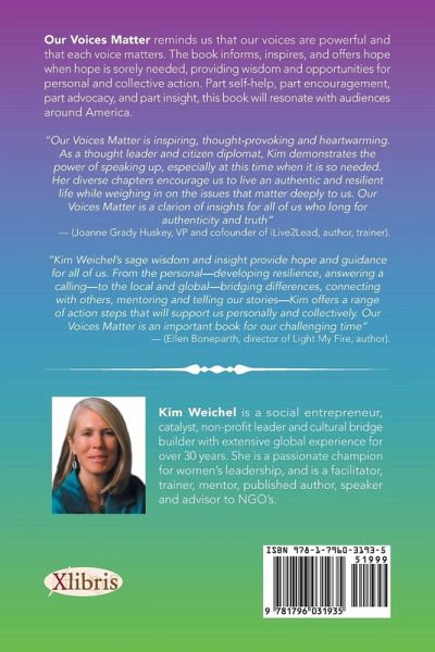 Our Voices Matter reminds us that our voices are powerful and that each voice matters. The book informs, inspires, and offers hope when hope is sorely needed, providing wisdom and opportunities for personal and collective action. Part self-help, part encouragement, part advocacy, and part insight, this book will resonate with audiences around America. "Our Voices Matter is inspiring, thought-provoking and heartwarming. As a thought leader and citizen diplomat, Kim demonstrates the power of speaking up, especially at this time when it is so needed. Her diverse chapters encourage us to live an authentic and resilient life while weighing in on the issues that matter deeply to us. Our Voices Matter is a clarion of insights for all of us who long for authenticity and truth" (Joanne Grady Huskey, vice president and cofounder of iLive2Lead, author, trainer). "Kim Weichel's sage wisdom and insight provide hope and guidance for all of us. From the personal-developing resilience, answering a calling-to the local and global-bridging differences, connecting with others, mentoring and telling our stories-Kim offers a range of action steps that will support us personally and collectively. Our Voices Matter is an important book for our challenging time" (Ellen Boneparth, director of Light My Fire, author).