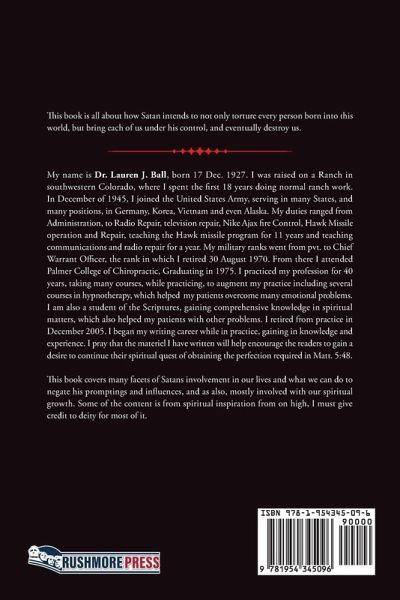 This book is all about how Satan intends to not only torture every person born into this world, but bring each of us under his control, and eventually destroy us. This book covers many facets of Satans involvement in our lives and what we can do to negate his promptings and influences, and as also, mostly involved with our spiritual growth. Some of the content is from spiritual inspiration from on high, I must give credit to deity for most of it.
