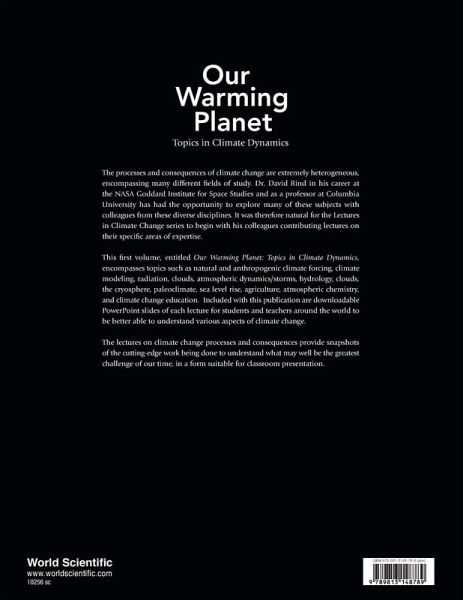 The processes and consequences of climate change are extremely heterogeneous, encompassing many different fields of study. Dr David Rind in his career at the NASA Goddard Institute for Space Studies and as a professor at Columbia University has had the opportunity to explore many of these subjects with colleagues from these diverse disciplines. It was therefore natural for the Lectures in Climate Change series to begin with his colleagues contributing lectures on their specific areas of expertise. This first volume, entitled Our Warming Planet: Topics in Climate Dynamics, encompasses topics such as natural and anthropogenic climate forcing, climate modeling, radiation, clouds, atmospheric dynamics/storms, hydrology, clouds, the cryosphere, paleoclimate, sea level rise, agriculture, atmospheric chemistry, and climate change education. Included with this publication are downloadable PowerPoint slides of each lecture for students and teachers around the world to be better able to understand various aspects of climate change. The lectures on climate change processes and consequences provide snapshots of the cutting-edge work being done to understand what may well be the greatest challenge of our time, in a form suitable for classroom presentation.