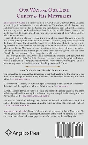 The present volume is a shorter edition of Christ in His Mysteries, Dom Columba Marmion's profound reflection on the Mysteries of Christ's birth, death, Resurrection, and Ascension as presented in the Gospels and the Liturgical Year. In Blessed Marmion's words, the mysteries that Jesus lived were lived for us. In them He shows Himself as our model and wills to make Himself one with our souls as Head of the Mystical Body of which we are members. Advent, Christmas, Holy Week, Paschaltide, the feasts of Corpus Christi and the Sacred Heart--following Christ in this way, uniting ourselves to Him, we share more deeply in His Divinity and His Divine life. The Sovereign Pontiff Pius X wrote in his encyclical of November 23rd, 1903, that "the active participation of the faithful in the sacred mysteries and in the public and solemn prayers of the Church is the first and indispensable source of the Christian spirit." There is no surer way, no more infallible means, of making us one with Christ