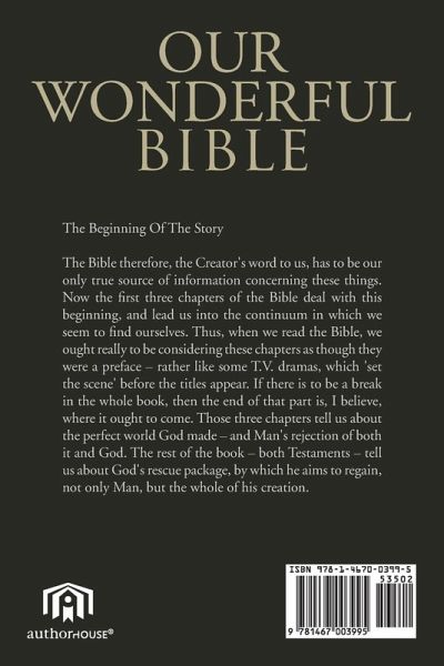 The Beginning Of The Story The Bible therefore, the Creator's word to us, has to be our only true source of information concerning these things. Now the first three chapters of the Bible deal with this beginning, and lead us into the continuum in which we seem to find ourselves. Thus, when we read the Bible, we ought really to be considering these chapters as though they were a preface - rather like some T.V. dramas, which 'set the scene' before the titles appear. If there is to be a break in the whole book, then the end of that part is, I believe, where it ought to come. Those three chapters tell us about the perfect world God made - and Man's rejection of both it and God. The rest of the book - both Testaments - tell us about God's rescue package, by which he aims to regain, not only Man, but the whole of his creation.
