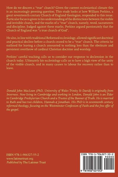 How do we discern a "true" church? Given the current ecclesiastical climate this is an increasingly pressing question. This study looks at how William Perkins, a great seventeenth-century Church of England theologian, responded to this issue. Particular focus is given to his understanding of the distinctions between the visible and invisible church, and the marks of a "true" church, namely, word, sacraments and discipline. Judged against these marks, Perkins argued passionately that the Church of England was "a true church of God". He also, in line with traditional Reformed ecclesiology, allowed significant doctrinal and practical decline before a church ceased to be a "true" church. The criteria he outlined for leaving a church amounted to nothing less than the obstinate and persistent overthrow of cardinal Christian doctrine and worship. Perkins' careful teaching calls us to consider our response to declension in the church today. Ultimately his ecclesiology calls us to have a high view of the unity of the visible church, and in many causes to labour for recovery rather than to leave.